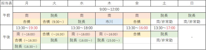 | AM | 9:00〜12:00 | 9:00〜12:00 | 9:00〜12:00 | 9:00〜12:00 | 9:00〜12:00 | 9:00〜12:00 | 9:00〜12:00 |